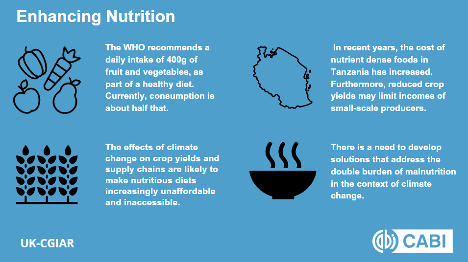 Food systems are vulnerable to the effects of climate change. The effects on yields and supply chains are likely to make nutritious diets increasingly unaffordable and inaccessible, and exacerbate existing issues with diet quality and health disparities. In recent years, the cost of nutrient dense foods in Tanzania has increased. Furthermore, reduced crop yields may limit incomes of small-scale producers. Interventions to support fruit and vegetable production, market access and consumption, including for example through micro-irrigation schemes, behaviour change programmes or targeted voucher schemes can reduce vulnerability to climate change, while improving diets of disadvantaged groups.